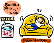 手垢や汗による汚れ 肘や座の前部などの手垢や汗による汚れは、布地を特に劣化させやすく、破れの原因になりやすいので常にお手入れをしてください。中性洗剤を温湯(40℃位)で薄め、布に浸し、固く絞って毛方向、または後ろから前、上から下の方向にふいてください。数回繰り返し、その後きれいな温湯でふいてください。