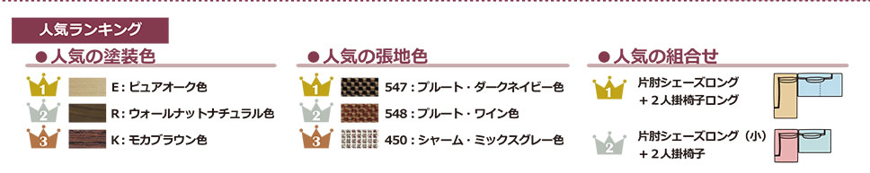 ソファーやダイニングチェアーは木部色と張地の人気の組合せもご紹介します。ぜひ接客時の参考にしてください。