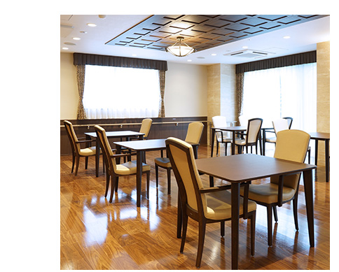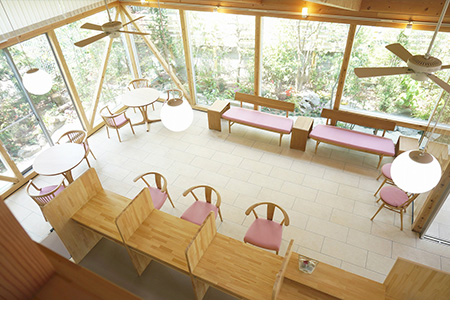 杉材をふんだんに使用した吹き抜けのある明るい室内からは、建物を囲む緑豊かなお庭を眺めることができます。喫茶店のようにくつろぎながら、待ち時間をお過ごしいただける癒し空間となっています。