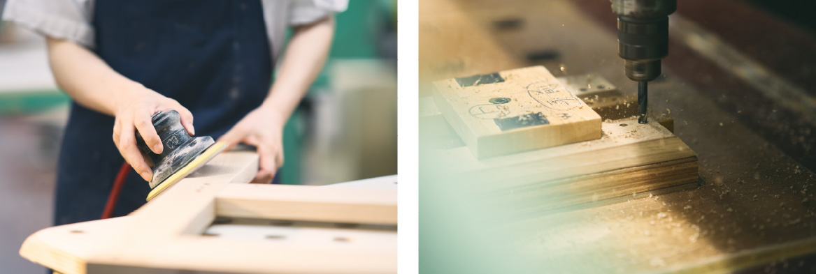 天然素材である木には、ひとつとして同じものがない、オンリーワンの魅力があります。その性質を見極め、確かな製品に仕上げるために、経験をつんだ職人の知恵と手技が活かされています。さらに、より多くの方に高い品質をお届けするため、最新のエレクトロニクスを導入。人の技と技術が融合し、革新的なものづくりを実践しています。