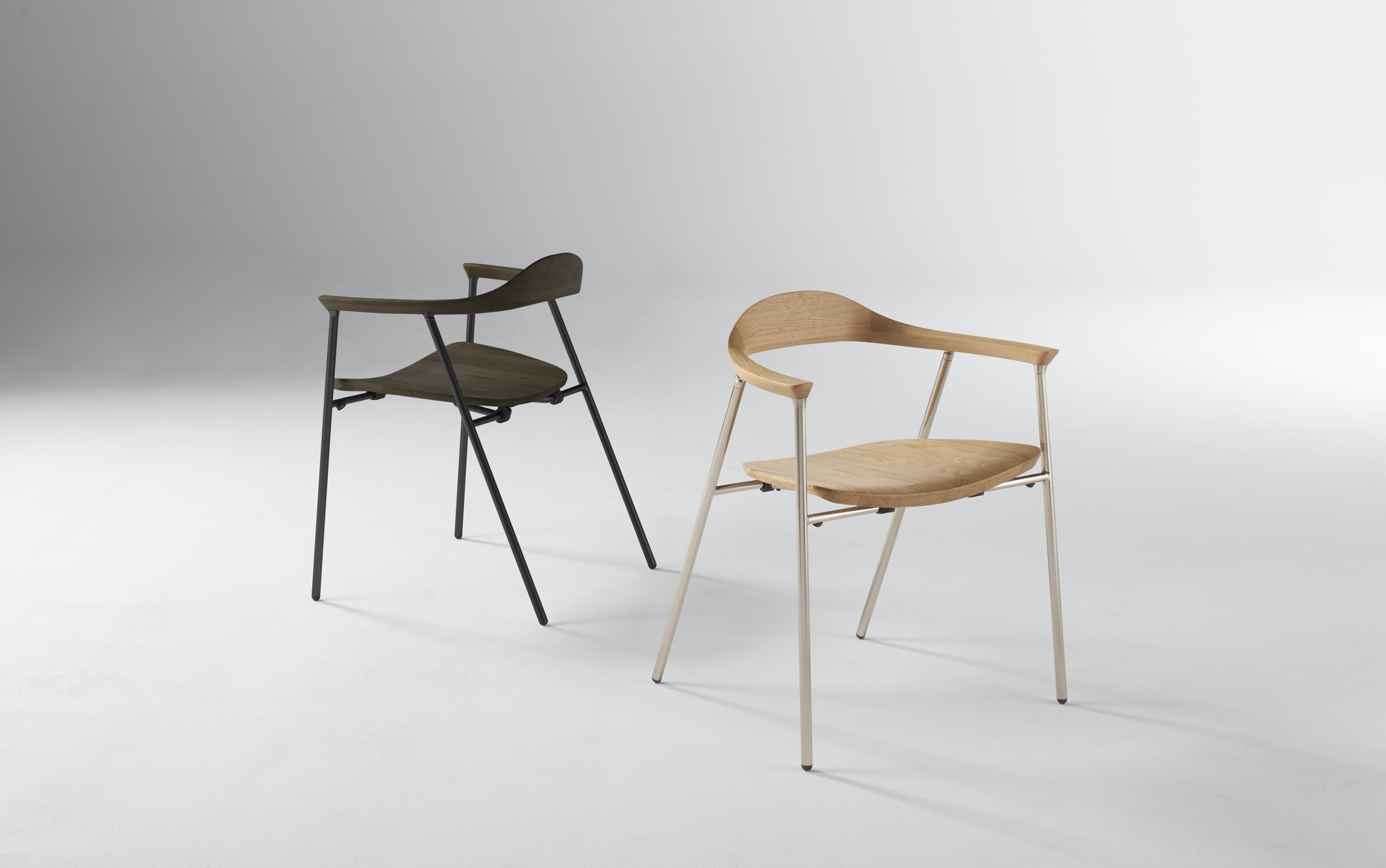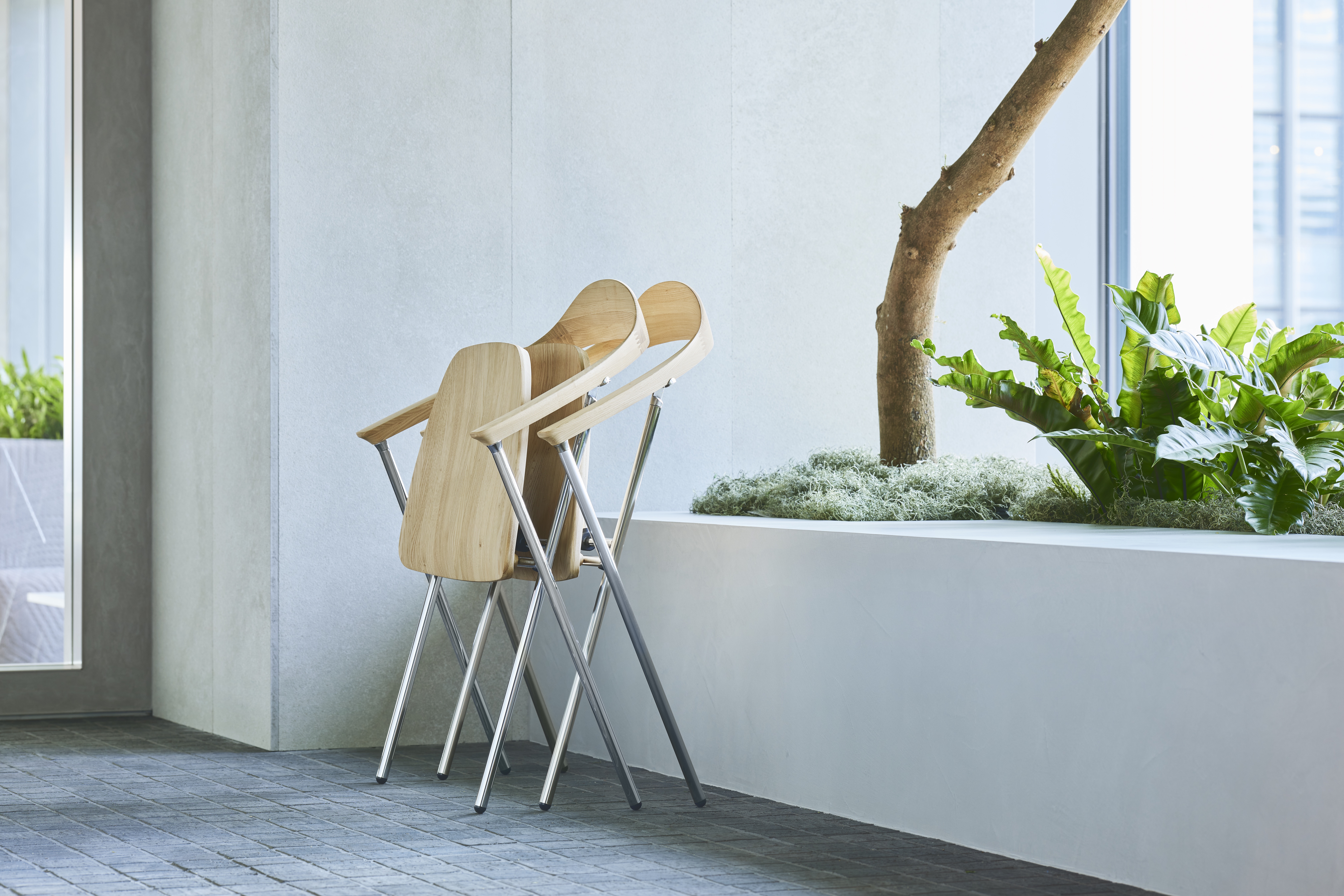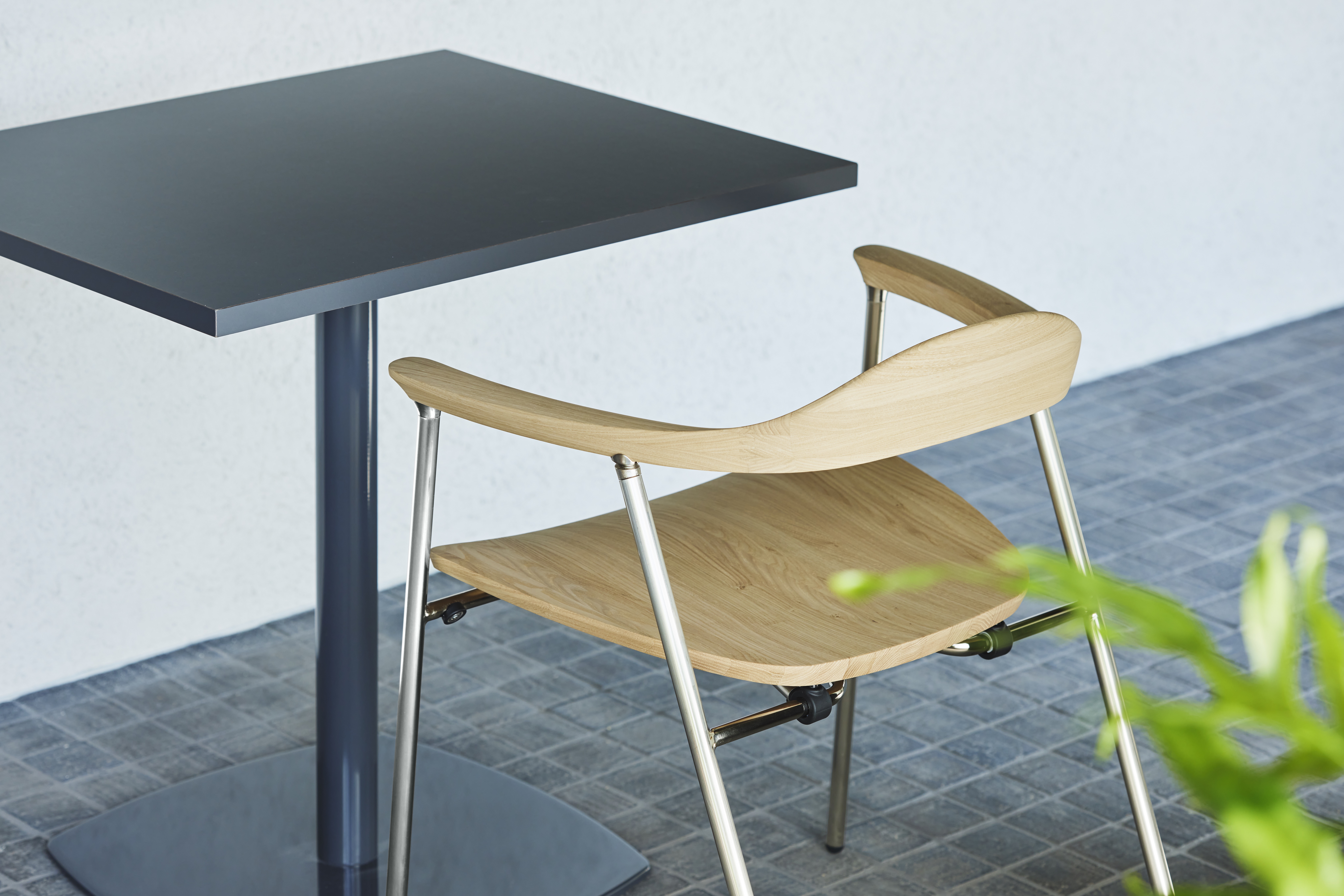 〈クロッサWOOD〉は、ダイニングチェアのような美しいシルエットを備えながら、折りたたみ・自立・ネスティング収納を可能にした、ワークシーン向けの木製チェアです。