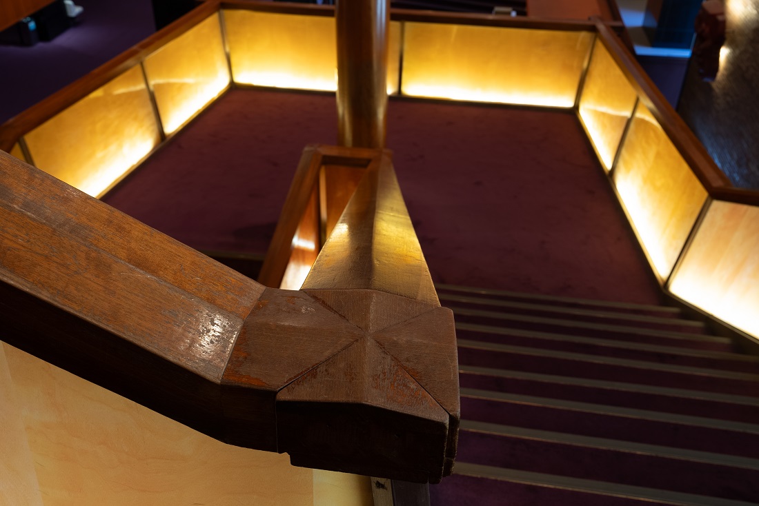 階段の手摺りを支えていた突板アクリル材は、照明とBOXの4アイテムへと活用。階段外側で使用されていたマホガニーと、内側で使用されていたトチの2種をラインナップ。特に照明は、帝劇ロビーと同じく内側下部にライトを仕込み、ロビーの雰囲気を追求した上品な仕上がりです。