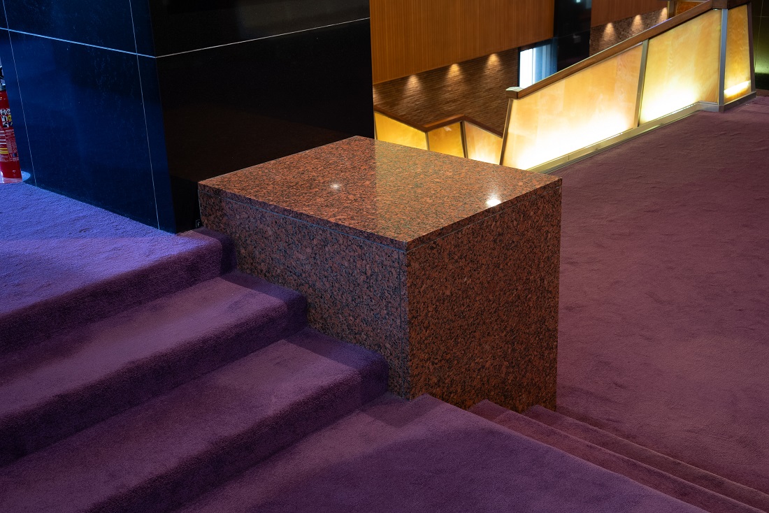 ロビー柱の自然石からは、7アイテムが誕生。1966年の開場当初からロビーを見つめてきたスウェーデン産のインペリアルレッドとブラックスェード。今では産出されなくなった非常に貴重な自然石を贅沢に使用し、コースターセットや3種の箸置きが誕生しました。
