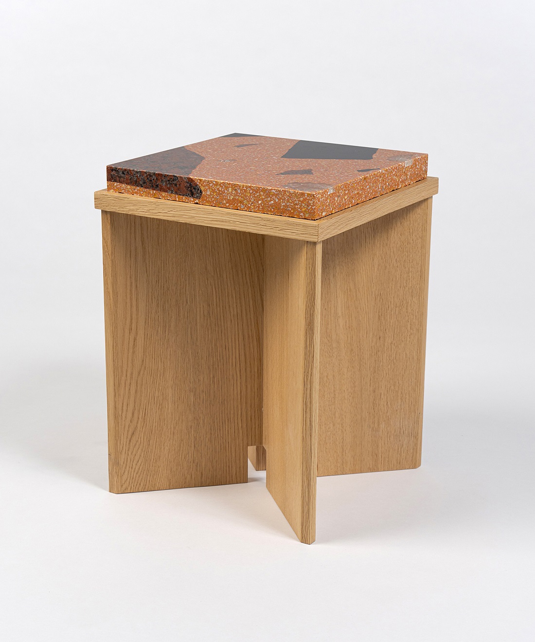 ロビー客席側の壁のレンガや、入口のガラス扉の欠片も余すことなく活用。ロビー柱の自然石も加え、レガシーをミックスした天板のテラゾーテーブルも製作しました。レガシーベージュとレガシーオレンジの2カラー展開です。