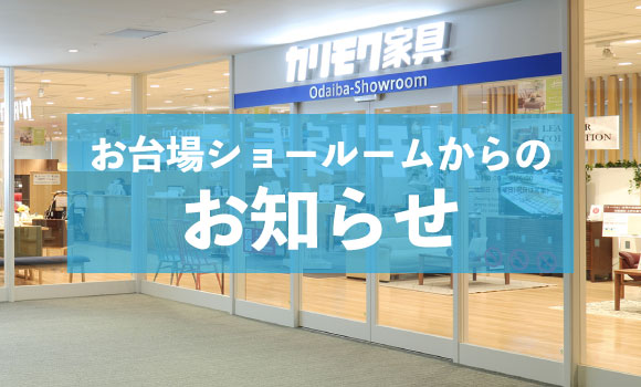 お台場のダイバーシティ東京5階にある木製家具メーカーのショールームです。ワンフロアの展示スペースで見て触れて体感しながら、じっくりと家具選びをお楽しみいただけます。どなたでも自由にご覧いただけます。