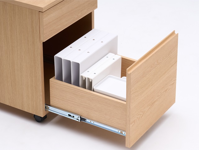 引き出し二段の中箱は汚れが落ちやすいハイテク素材のレアテックスを採用しています。下段引き出しにはA4ファイルボックスが収納できます。
