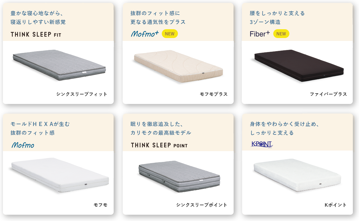 寝心地の好みは十人十色。硬さや寝返りのしやすさなどを、全6タイプのマットレスで実際に寝比べてご体感いただけます。