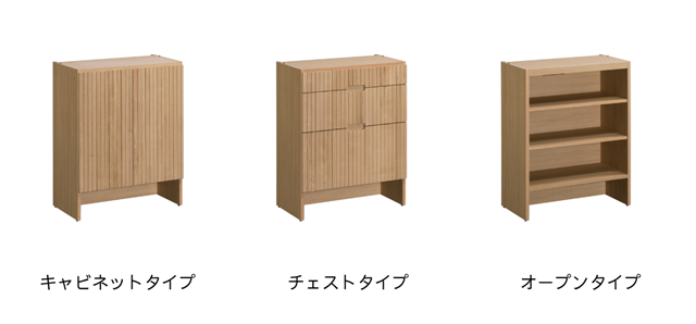 ユニットの種類は、キャビネットタイプ、チェストタイプ、オープンタイプの3種類。