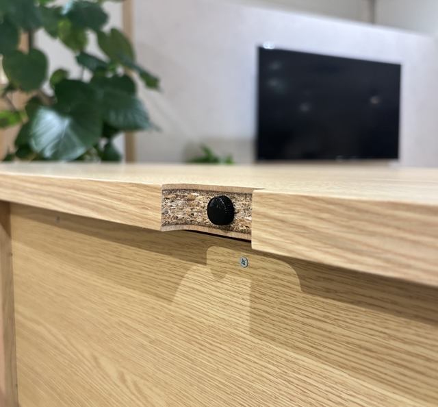 天板後部にテレビ通線用の切り欠き加工と、テレビ付属の固定ベルトを取り付けるユリアネジが付いています。