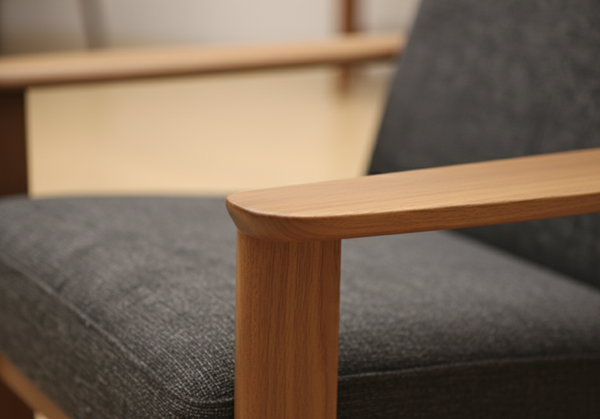 このソファの最大の魅力は、何と言ってもこの「温もり」あふれる木肘にあります。