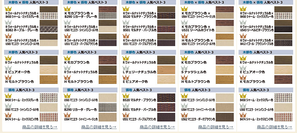 ソファーやダイニングチェアーは木部色と張地の人気の組合せもご紹介します。ぜひ接客時の参考にしてください。