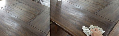 ダイニングテーブルは、油の汚れが、どうしても付着しやすいので、まずはシンナーを使い汚れを除去していきます。