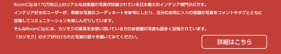 また、人気インテリア写真投稿サイト「RoomClip」には、カリモクの家具をお使い頂いている方の、お部屋のコーディネート写真も数多く投稿されています。商品の使い方の再発見に、ご提案の参考に、ぜひ覗いてみてください。