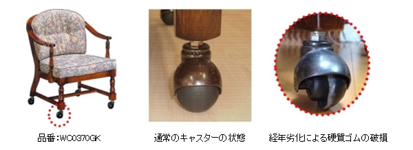 ボールキャスターは、家具に使われる様々な金属部品の中のひとつになりますが、経年によってボール部分の硬質ゴムが劣化して、写真のように割れてしまったり傷がついてしまったりして、そのままでは使用できなくなることがあります。