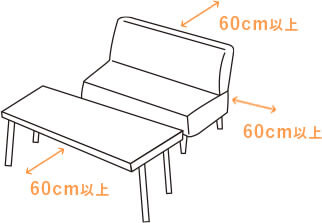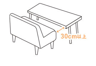 座りながらテーブルを使う場合は、座った時に足元にゆとりがある程度にあまり間を空けすぎないように。ソファーを背もたれにして床に座る場合は、60cm以上開けるのがベストです。大勢でくつろぐ機会が多い方は、余裕を持ってスペースを確保してください。